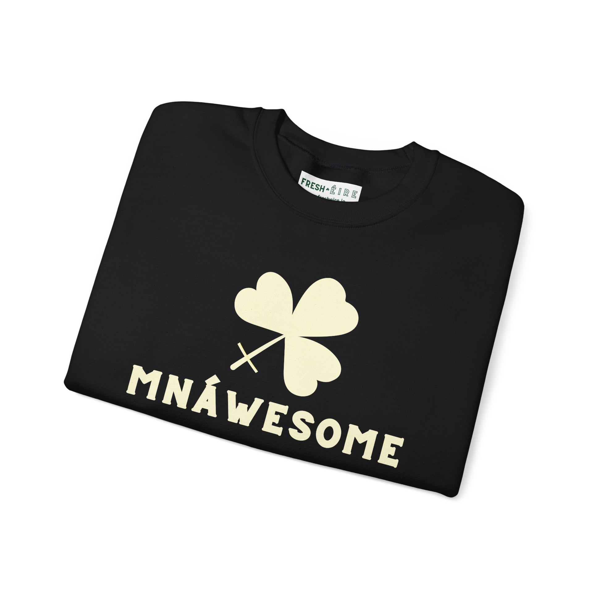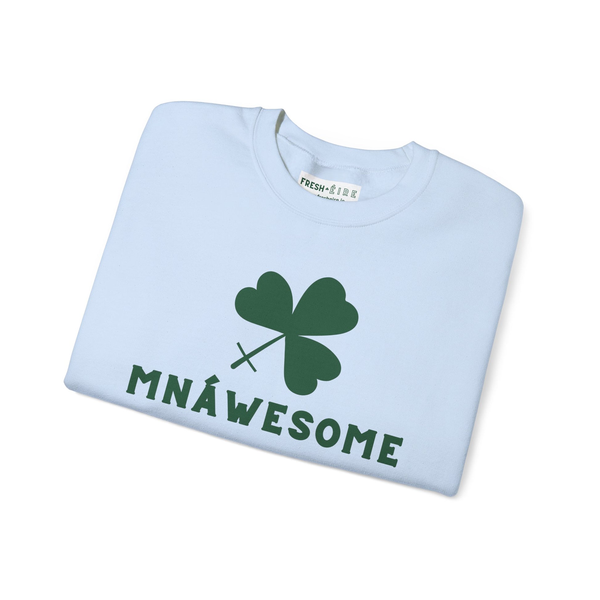 Celebrate the strength and spirit of Irish women with our MNÁWESOME Unisex Heavy Blend Crewneck Sweatshirt, featuring a playful downwards and to the right shamrock graphic with a cross at the end of its stalk, cleverly designed to resemble the woman symbol. Beneath this empowering graphic, the word MNÁWESOME " proudly declares the awesomeness of women in Irish (as Gaeilge Mná meaning women). Crafted with comfort and style in mind, this top is perfect for those who embrace their Irish heritage and champion women's empowerment. The shamrock, a symbol of Ireland, combined with the woman symbol, creates a powerful message of pride and unity. Whether you're marching in solidarity, hitting the streets, or simply lounging at home, this tee is sure to make a statement and spark meaningful conversations. Wear it with pride and celebrate the awesomeness of women everywhere with our MNÁWESOME shamrock symbol Unisex Heavy Blend Crewneck Sweatshirt