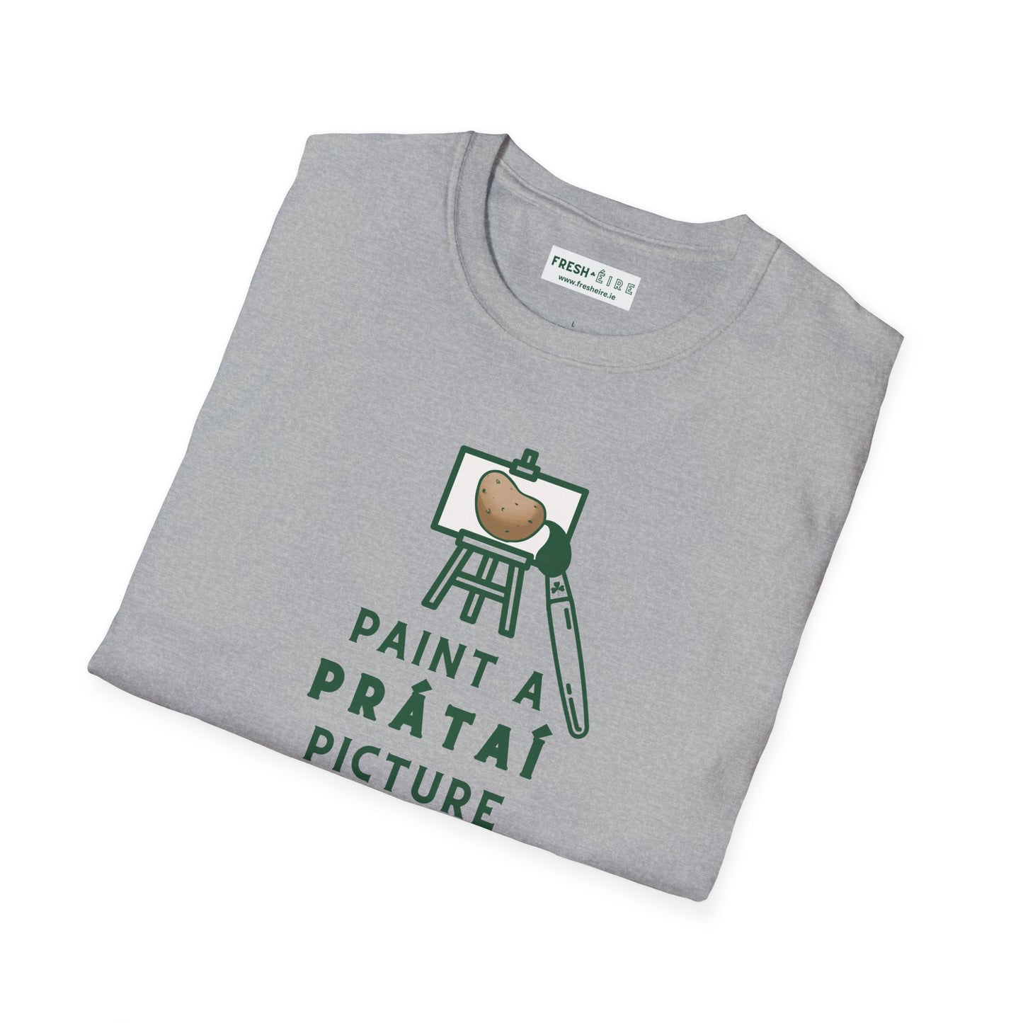 Our PAINT A PRÁTAÍ PICTURE Unisex Softstyle 100% Cotton T-Shirt is for celebrating the humble potato in true Irish style. A cheeky nod to Irish creativity and culture, perfect for those who appreciate a bit of craic and homegrown pride.